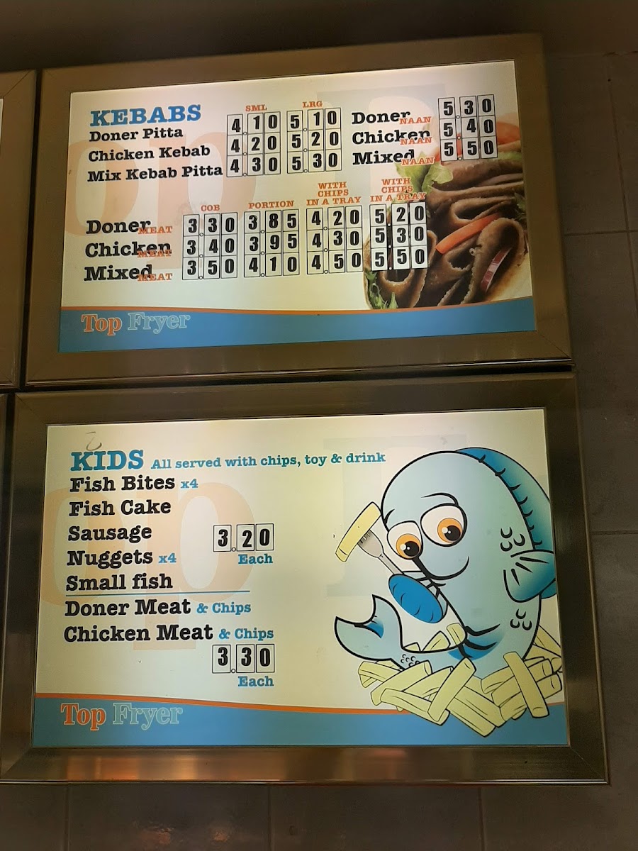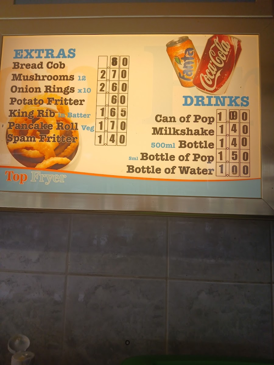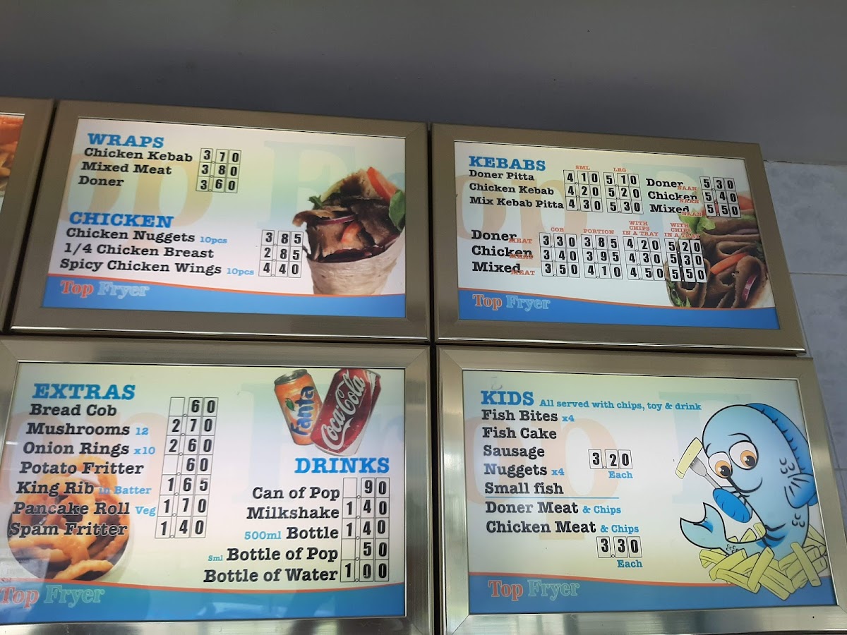 Oval Fish Bar in Sutton-in-Ashfield offers a variety of classic and comforting dishes that cater to all tastes. Their Kids menu features simple and tasty options like Fish Bites, Fish Cake, and Small Fish, perfect for younger diners. For those craving something heartier, the Kebabs section includes options such as the Doner Pitta, Chicken Kebab, and the Mix Kebab Pitta. The Wraps menu is another highlight, with Chicken Kebab, Mixed Meat, and Doner wraps for a quick and satisfying meal. If you're in the mood for chicken, choices like Chicken Nuggets, 1/4 Chicken Breast, and Spicy Chicken Wings are sure to please. The Extras menu offers side options like Bread Cob, Mushrooms, Onion Rings, and King Rib, adding a nice touch to any meal. Those with a love for burgers will enjoy selections such as the Burger, Cheese Burger, Chicken Burger, and Spicy Chicken, alongside the Battered Burger for a crispy twist. No meal is complete without Chips, and the restaurant serves them with options like Chips 'N' Cheese or any Mix of your choice. The Top Fryer Specials are also a great option, offering combos like Sml Fish, Sausage Or Fishcake and the 6ml Sausage & Fishcake. For seafood lovers, the Fish menu offers popular choices like Haddock, Plaice, Mini Fish, and Scampi, while the Fish Cake adds a flavorful twist. Complement your meal with a refreshing Can of Pop, Milkshake, or Bottle of Water. For extra flavor, don't forget the Pot Garlic Mayo. With such a wide range of options, Oval Fish Bar ensures a satisfying meal for everyone.